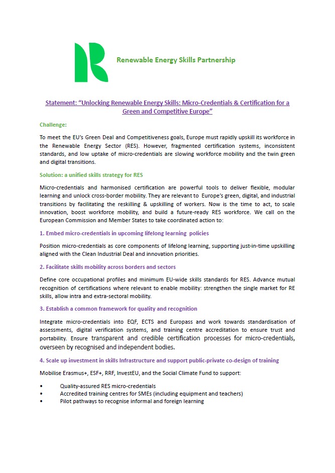 Renewable Energy Skills Partnership – Position paper on skills: Recommendations for addressing the skills challenge